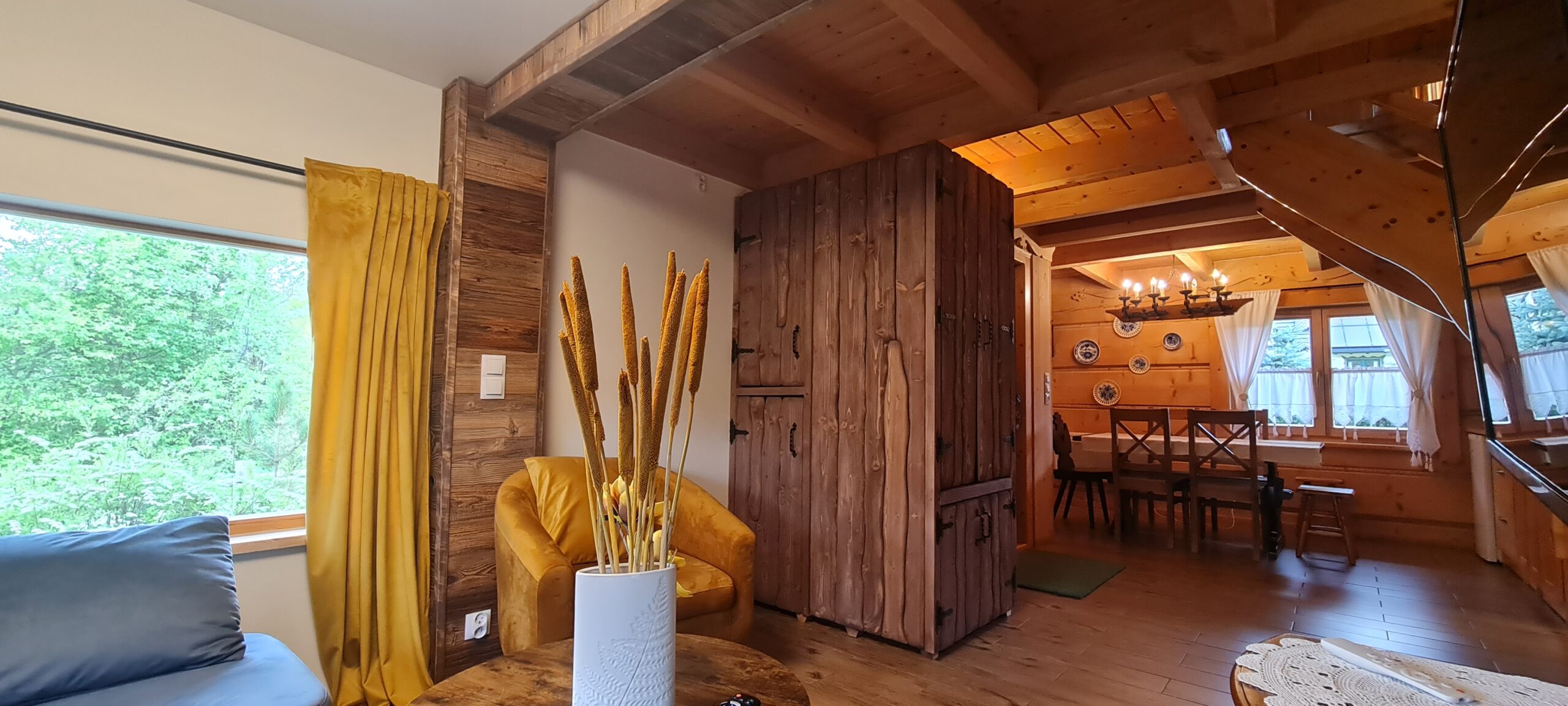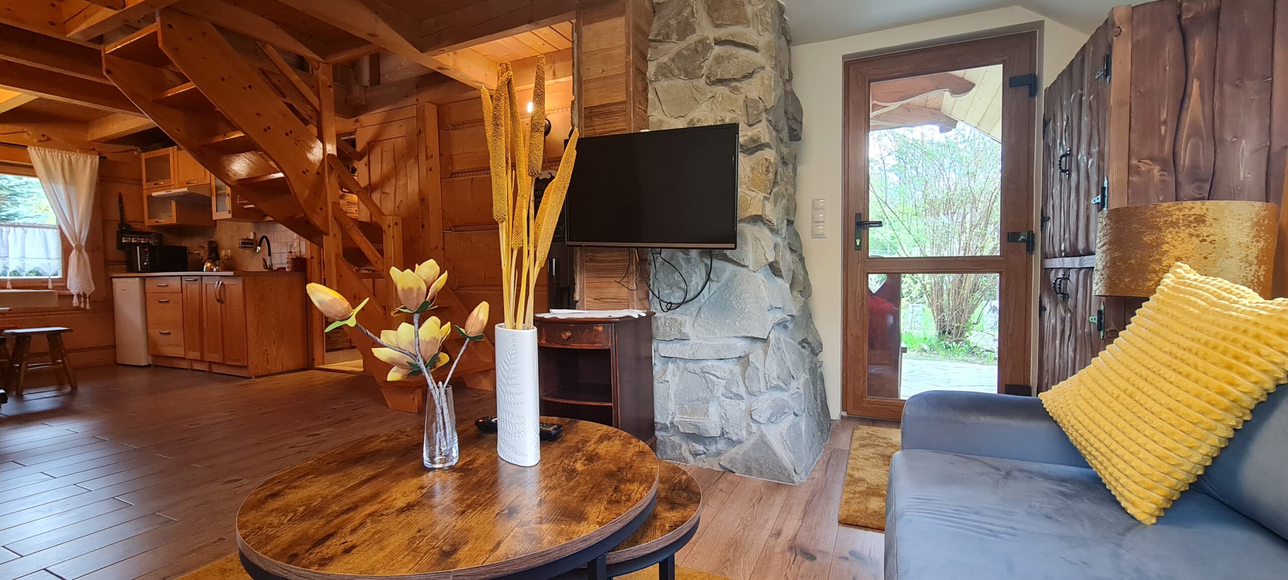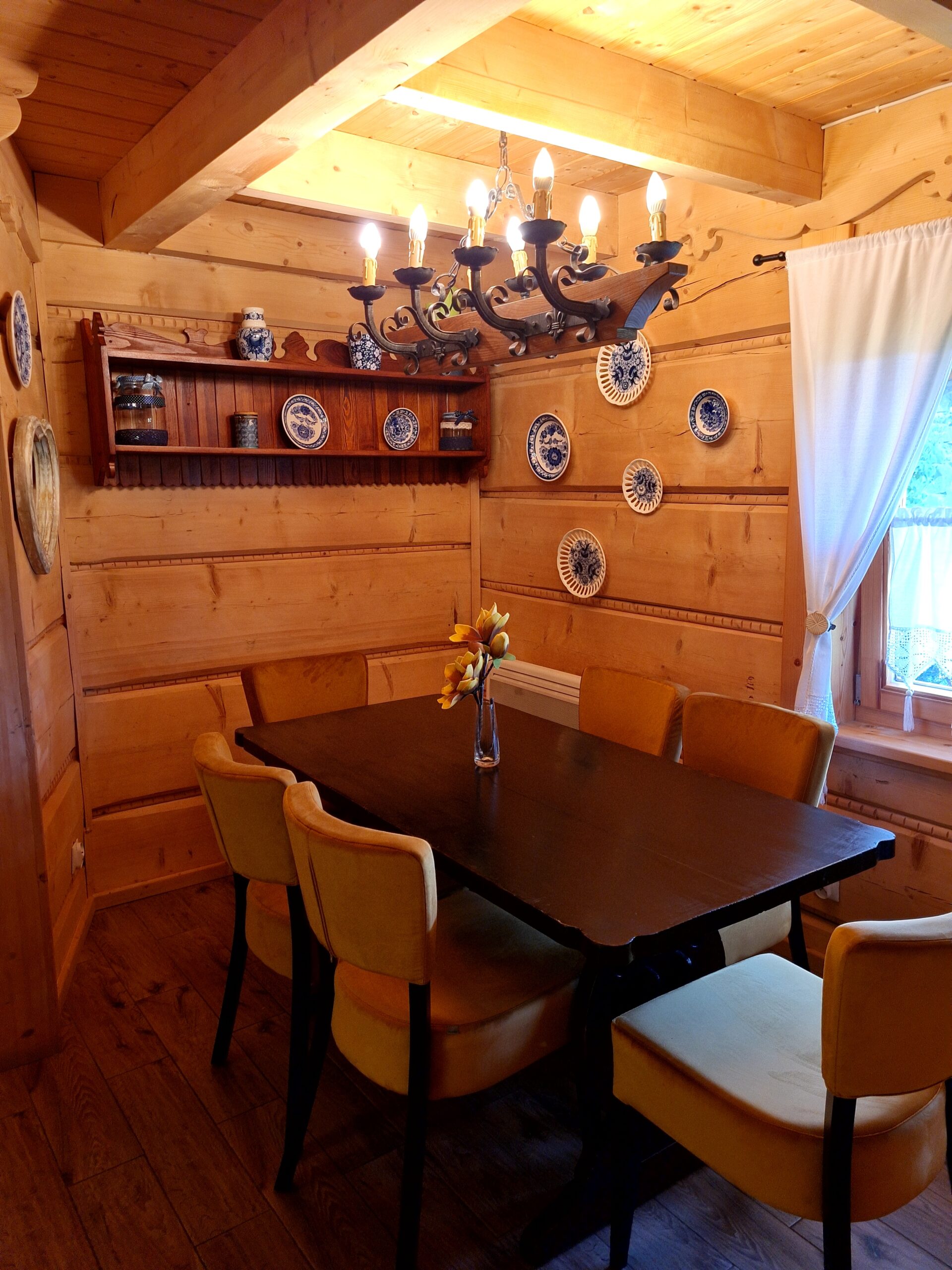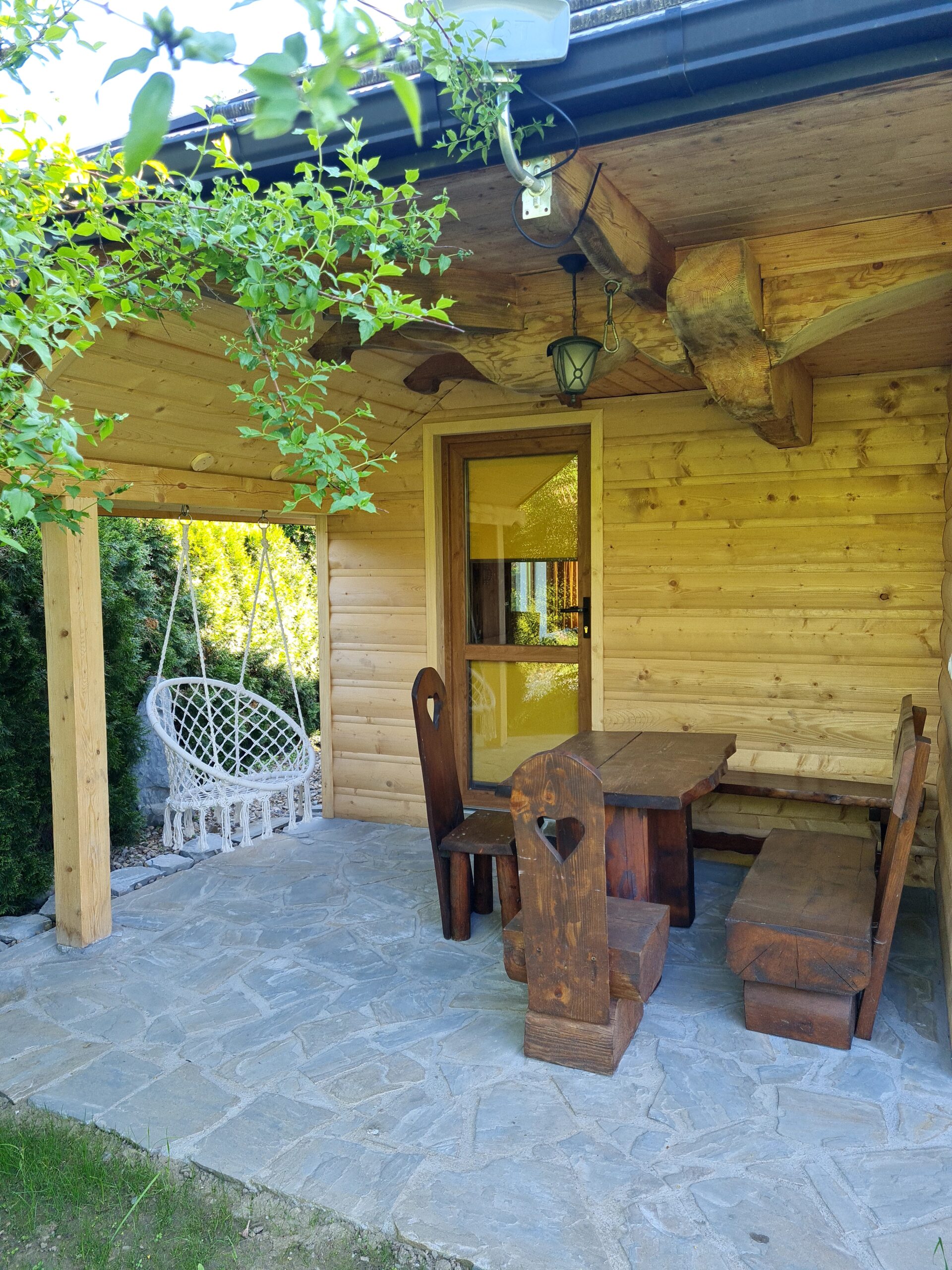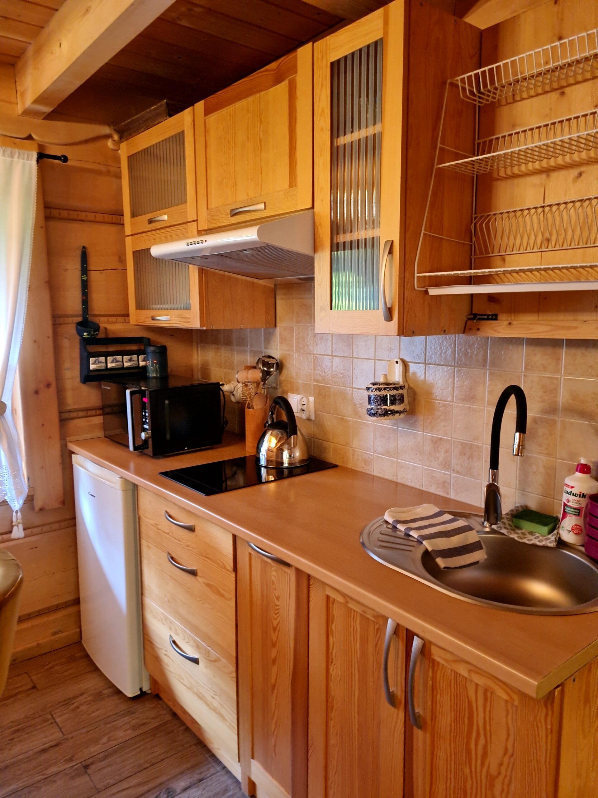 Oferujemy Państwu wypoczynek  w stylowej urokliwej chacie z drewnianych bali.  Domek  został uruchomiony w pierwszych dniach lipca 2015 r.  ale w 2024 r. przeszedł gruntowny remont  i zyskał nie tylko nowy wystrój , ale też dodatkową przestrzeń.  W chacie przygotowaliśmy dla Państwa   wygodny i luksusowo  wyposażony apartament  składający się z pokoju dziennego z aneksem kuchennym i łazienką  na parterze  oraz 2 sypialni  usytuowanych na poddaszu. Na poddaszu jest też druga toaleta z WC i umywalką.   Domek jest w pełni wyposażony. W kuchni znajdziecie Państwo wszystko co niezbędne do samodzielnego przygotowania posiłków. Jest spora, wolnostojąca lodówka, kuchenka indukcyjna dwupalnikowa oraz mikrofalówka. Są wszystkie naczynia i sztućce. W domku znajdziecie duży stół z sześcioma wygodnymi , tapicerowanymi krzesłami.