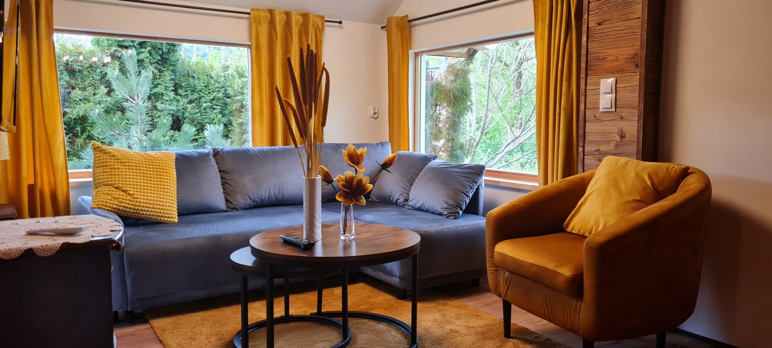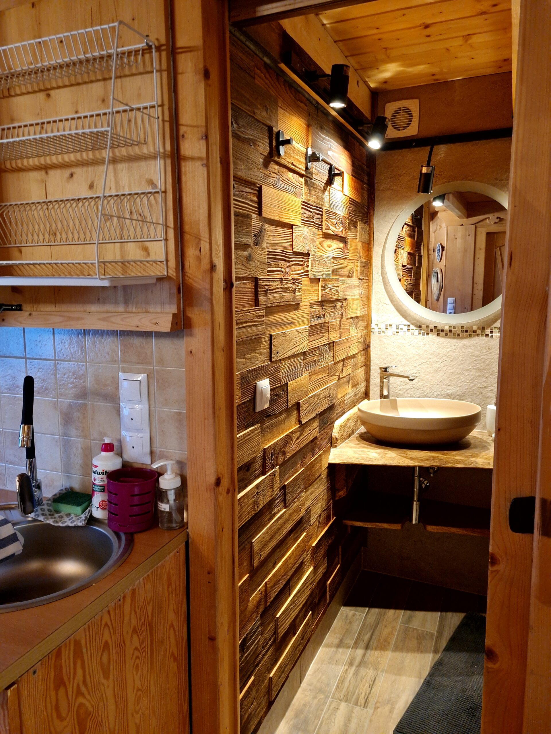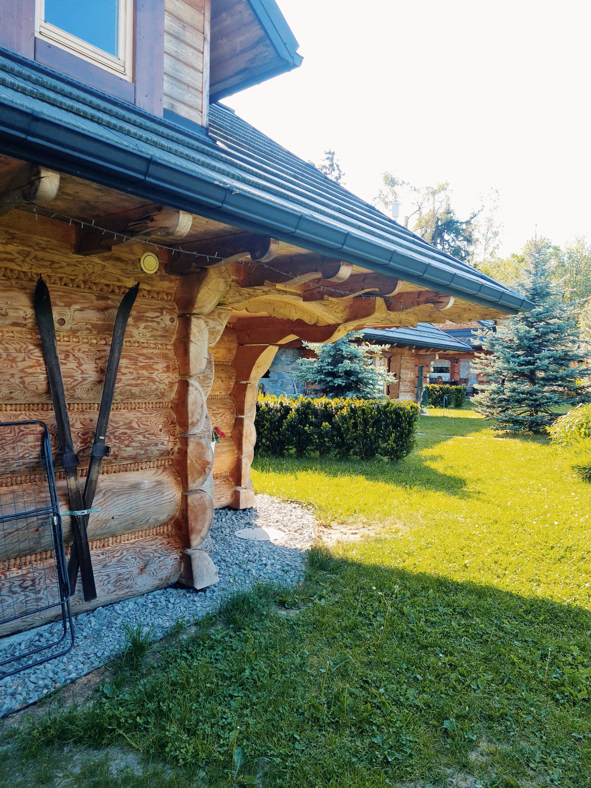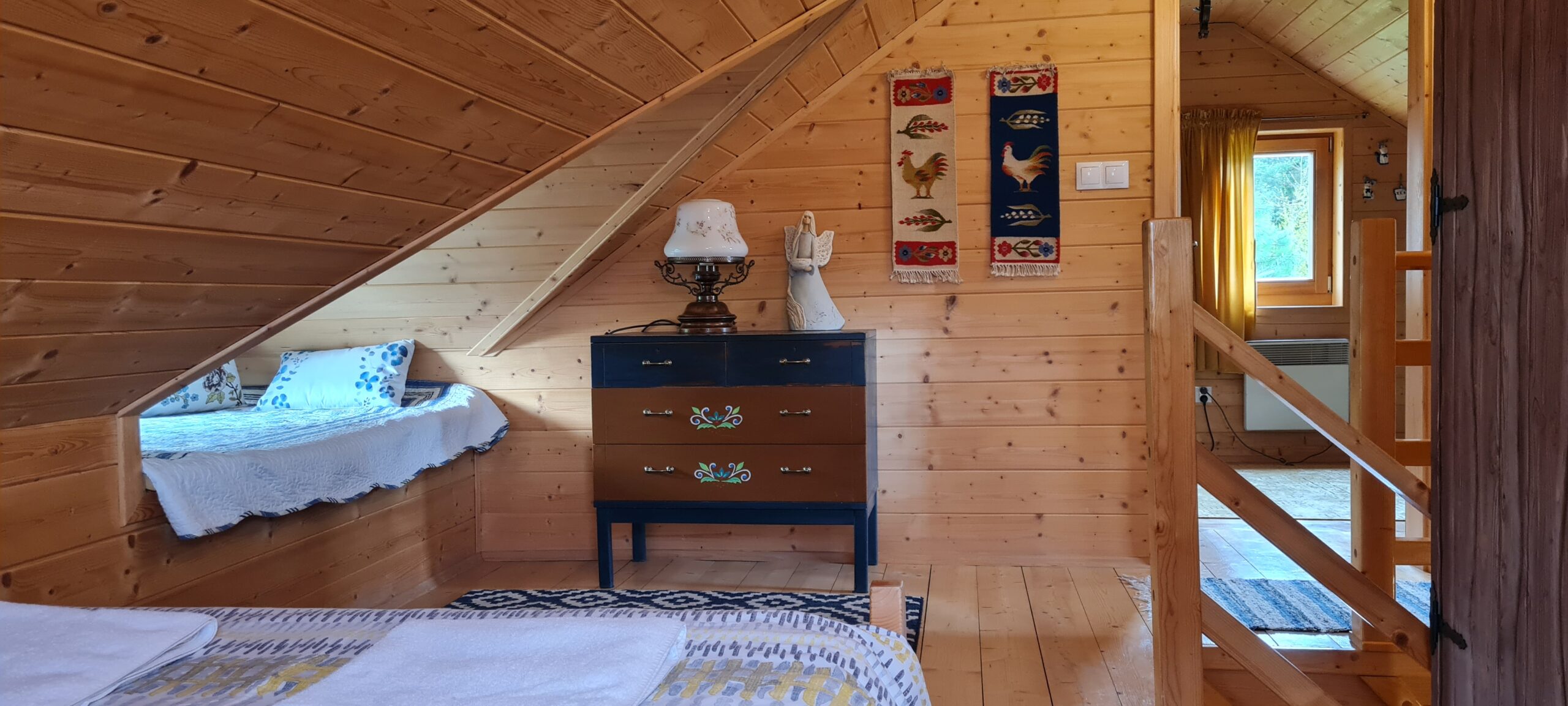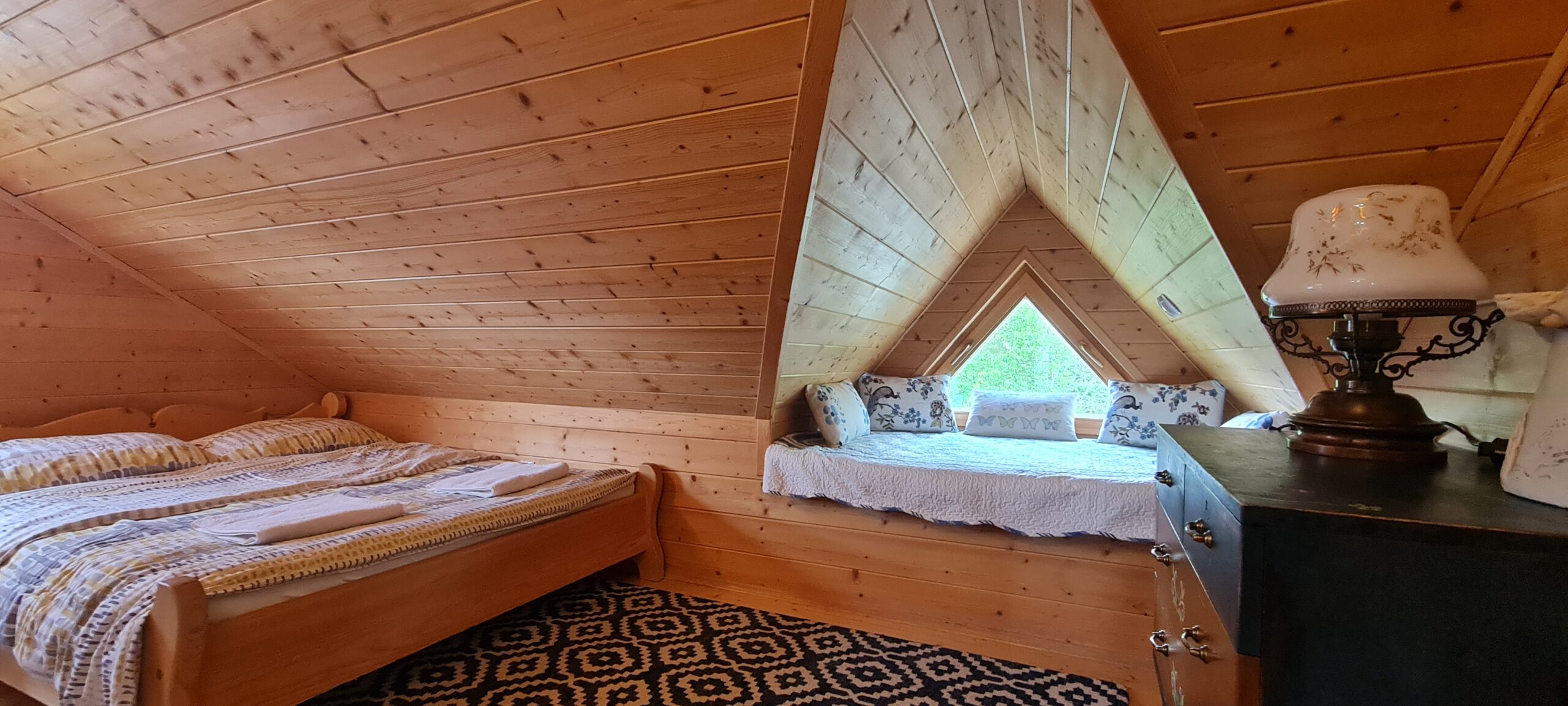 Oferujemy Państwu wypoczynek  w stylowej urokliwej chacie z drewnianych bali.  Domek  został uruchomiony w pierwszych dniach lipca 2015 r.  ale w 2024 r. przeszedł gruntowny remont  i zyskał nie tylko nowy wystrój , ale też dodatkową przestrzeń.  W chacie przygotowaliśmy dla Państwa   wygodny i luksusowo  wyposażony apartament  składający się z pokoju dziennego z aneksem kuchennym i łazienką  na parterze  oraz 2 sypialni  usytuowanych na poddaszu. Na poddaszu jest też druga toaleta z WC i umywalką.   Domek jest w pełni wyposażony. W kuchni znajdziecie Państwo wszystko co niezbędne do samodzielnego przygotowania posiłków. Jest spora, wolnostojąca lodówka, kuchenka indukcyjna dwupalnikowa oraz mikrofalówka. Są wszystkie naczynia i sztućce. W domku znajdziecie duży stół z sześcioma wygodnymi , tapicerowanymi krzesłami.