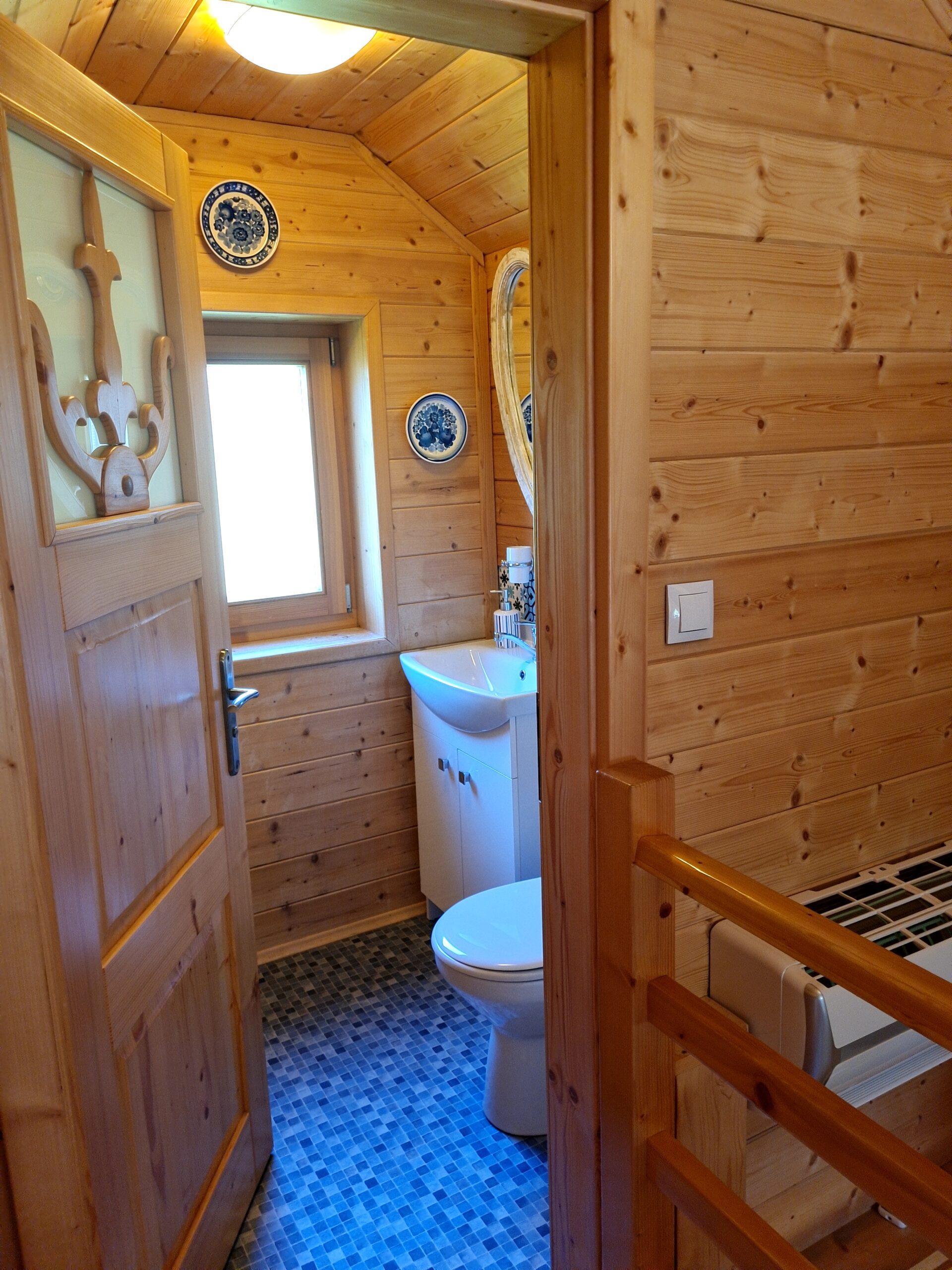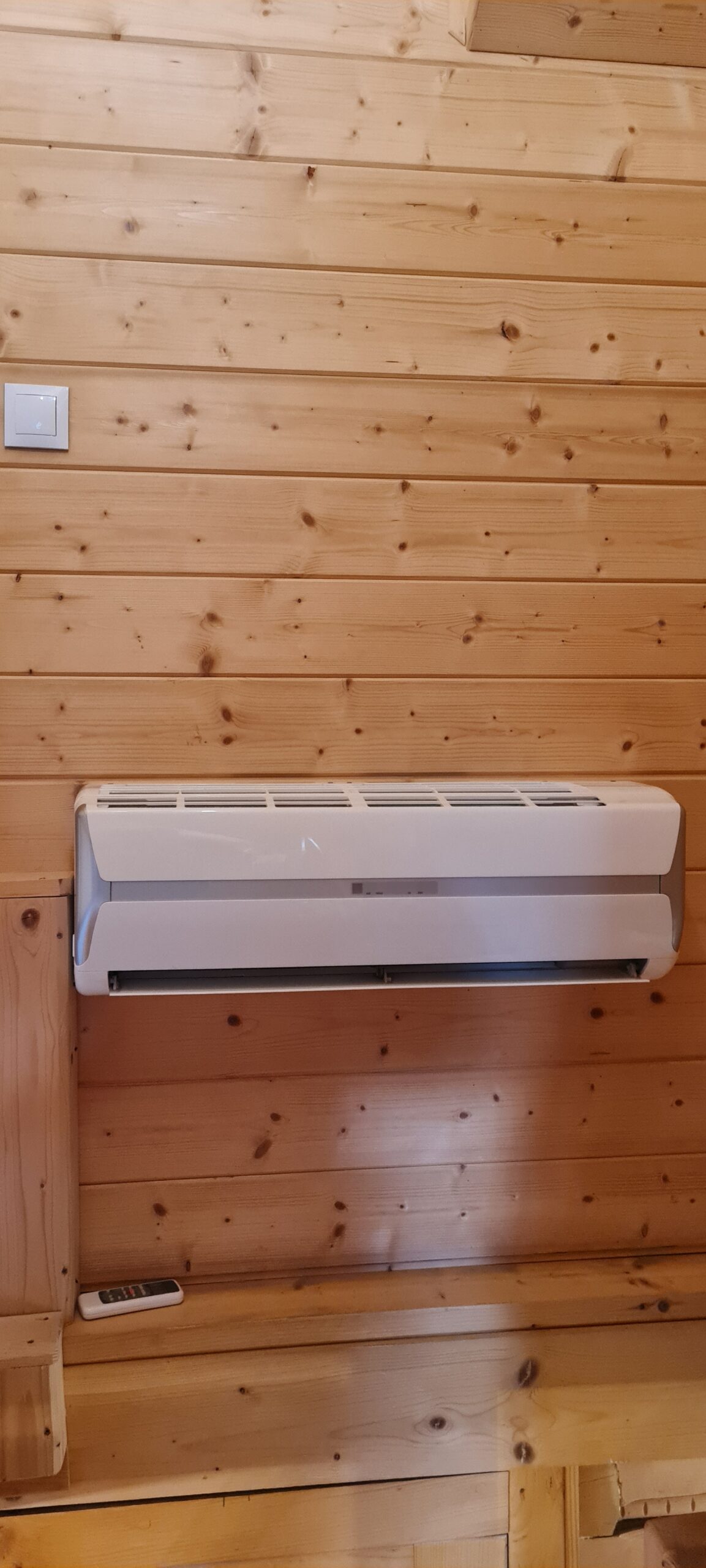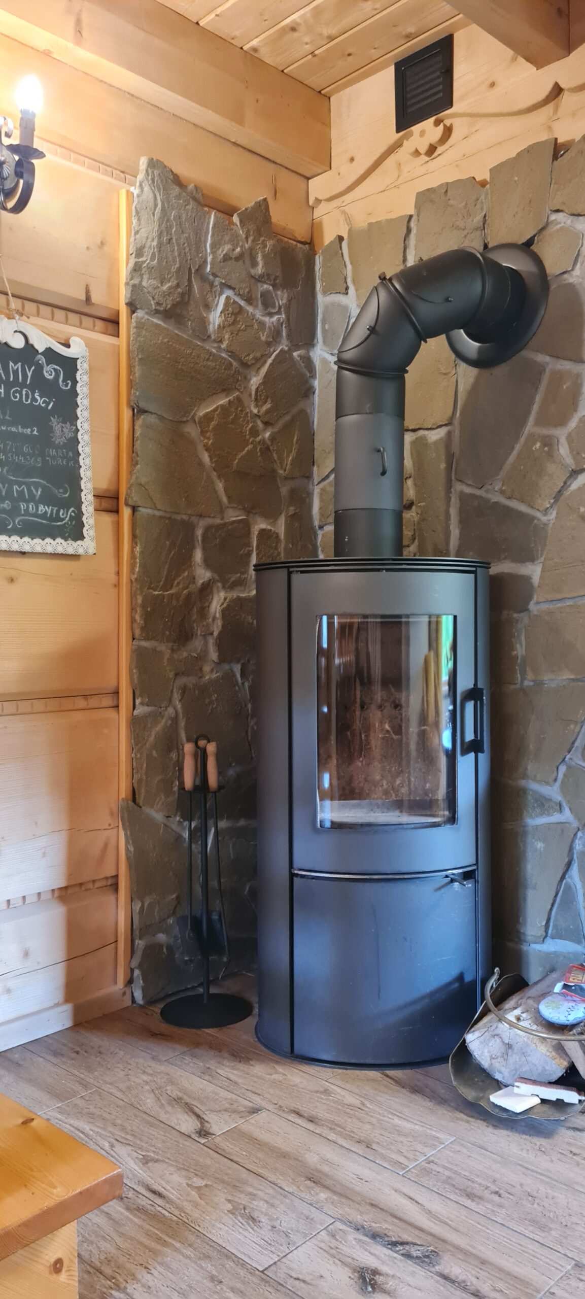 Ciepło zapewniają grzejniki elektryczne ale nasza chatka wyposażona jest też  w kominek , który zapewnia przede wszystkim dodatkowe ciepło ale też sprawia , że wieczory w chatce, zwłaszcza te chłodne,  nabierają uroku dzięki migającym płomieniom i strzelającym polanom drewna.   Dla wygody naszych gości w chatce zainstalowaliśmy też wydajną klimatyzację typu split , która  jest nieoceniona w upalne letnie dni. Może ona też być wykorzystywana jako dodatkowe źródło ciepła.