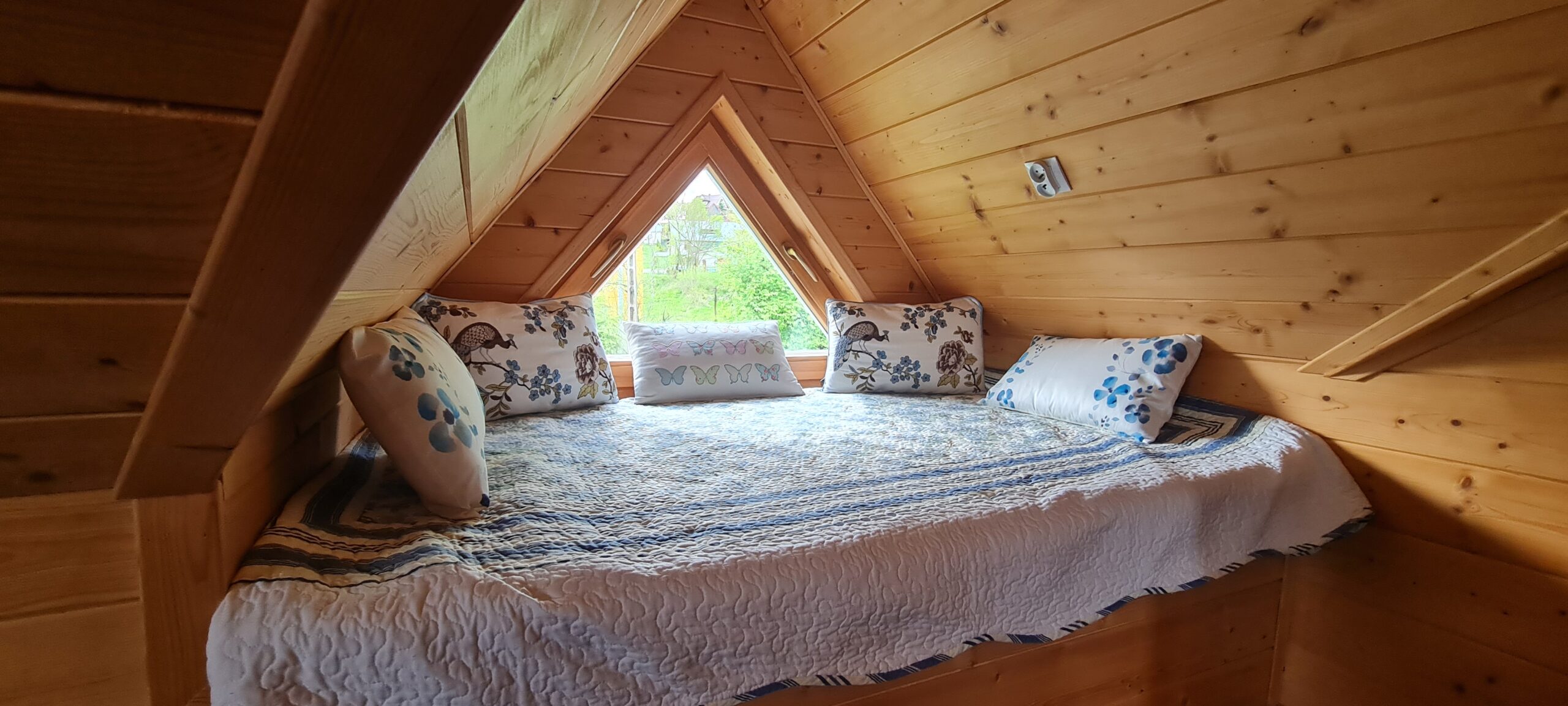 Domek ma łączną powierzchnię ok. 50 m2 i jest przewidziany dla  6 osób.     W pierwszej sypialniach są 2 łóżka pojedyncze 90×200 a w drugiej łóżko podwójne o wymiarach 120×200 cm . Nadto na otwartej przestrzeni poddasza jest duże łózko dwuosobowe o wymiarach 140×200 cm.   Istnieje możliwość przenocowania jednej dodatkowej osoby , bowiem w większej sypialni jest rozkładana sofa. Druga sofa , którą również można wykorzystać do spania znajduje się w części wypoczynkowej na parterze.  Nie ma możliwości przyjęcia w tym domku więcej niż 7 osób ( w tym dzieci)   Przy domku jest zadaszony taras ze stolikiem i krzesełkami.