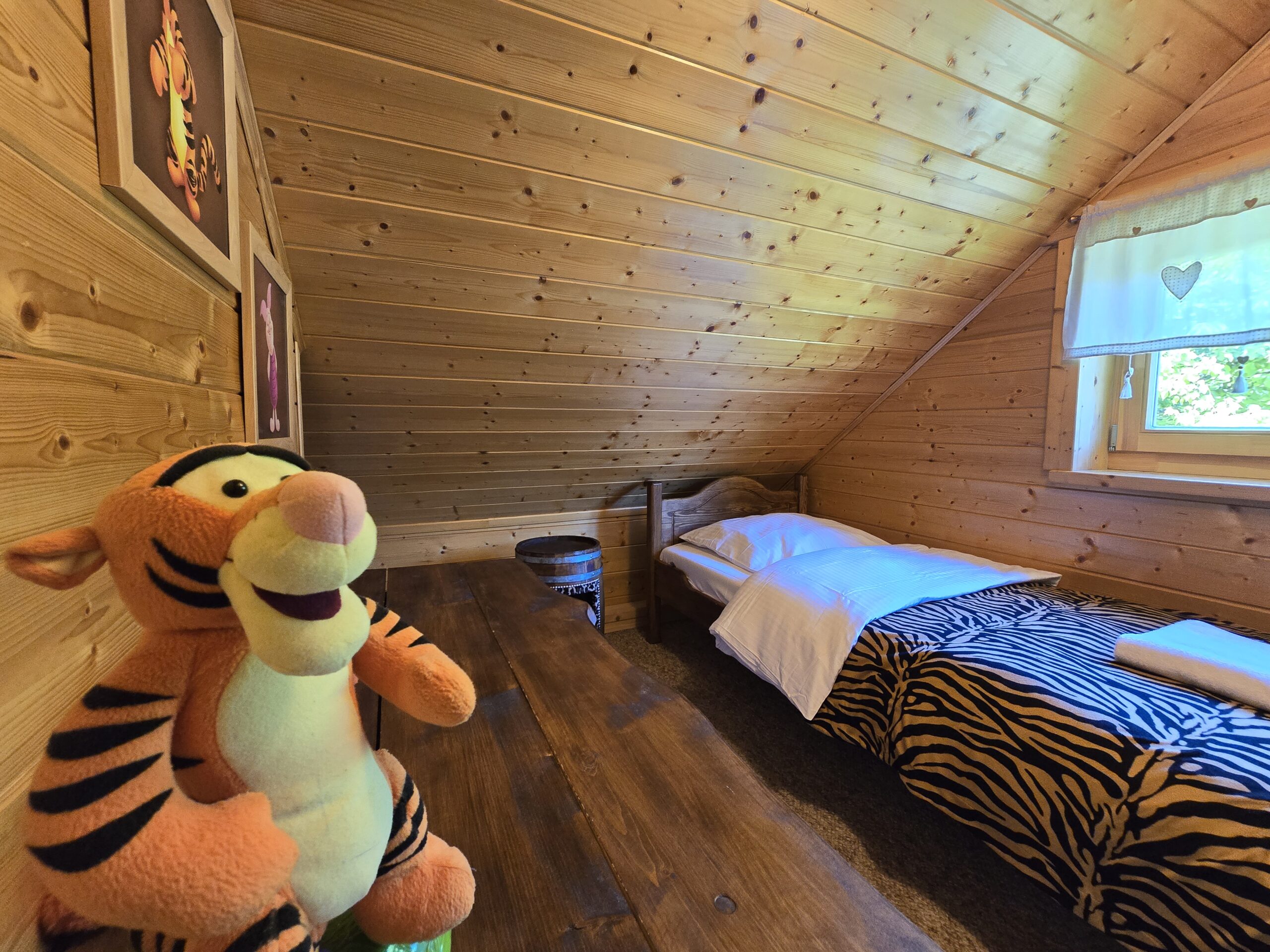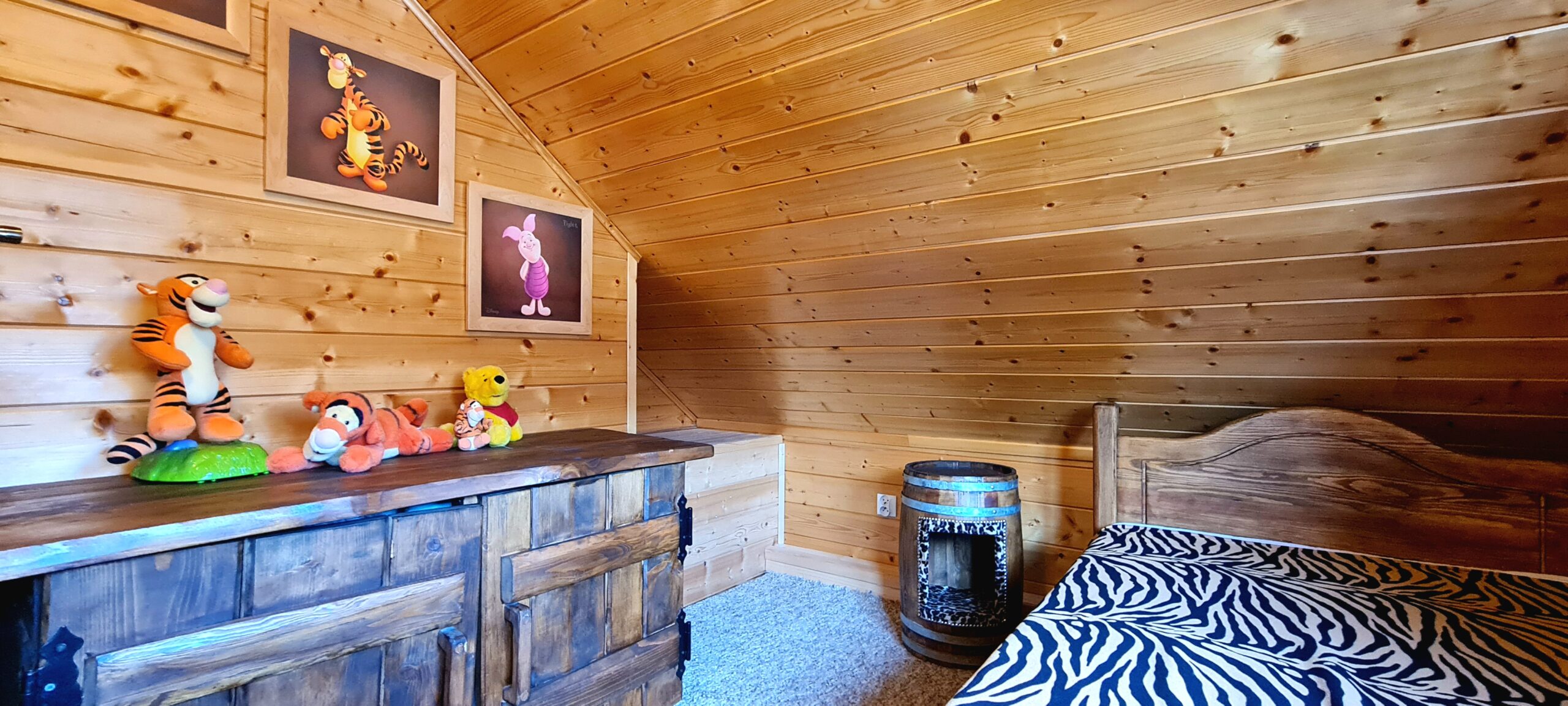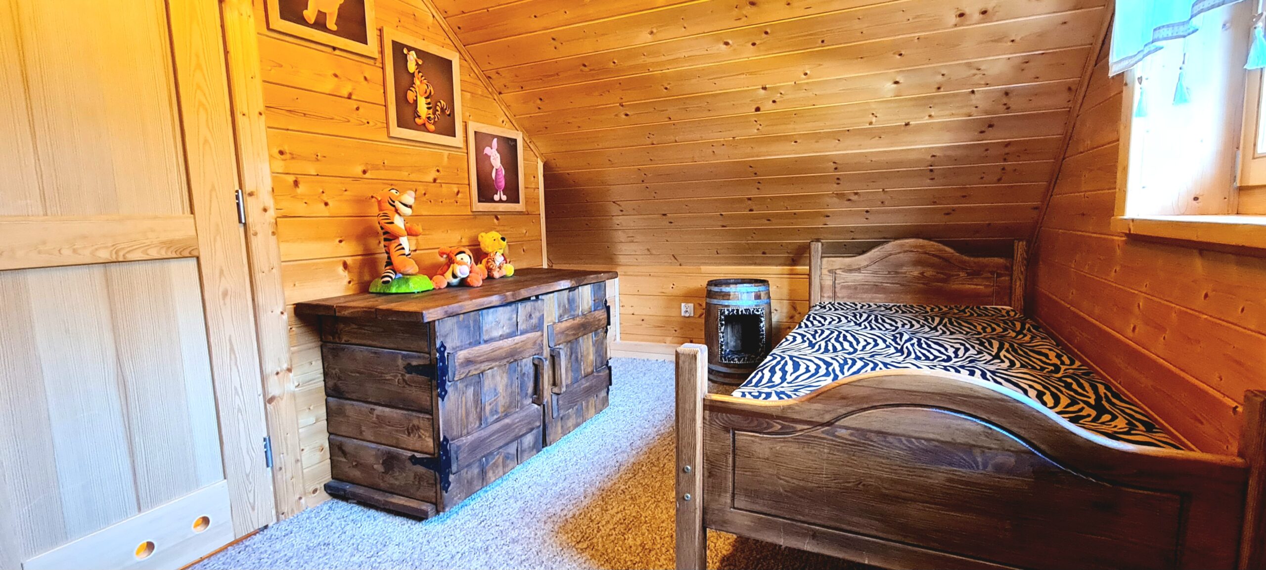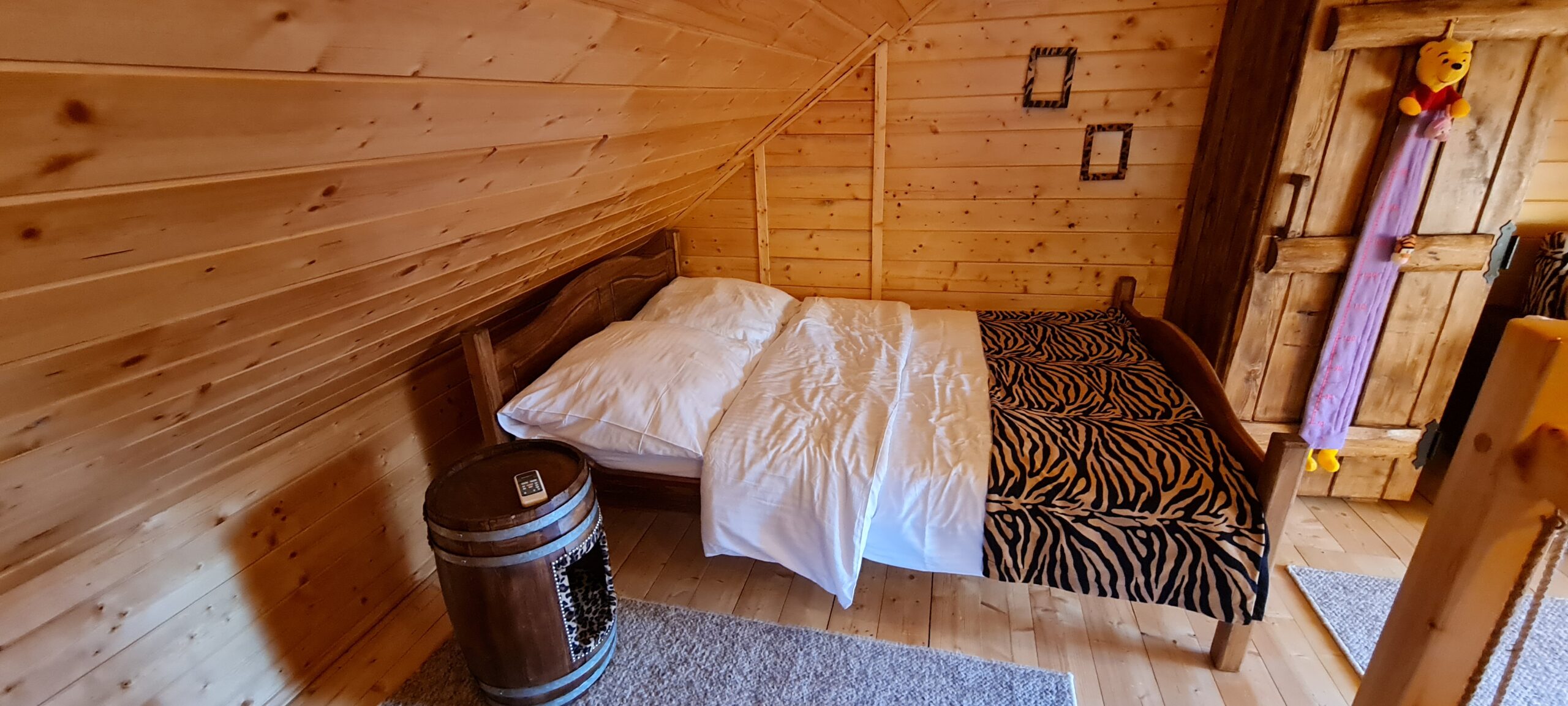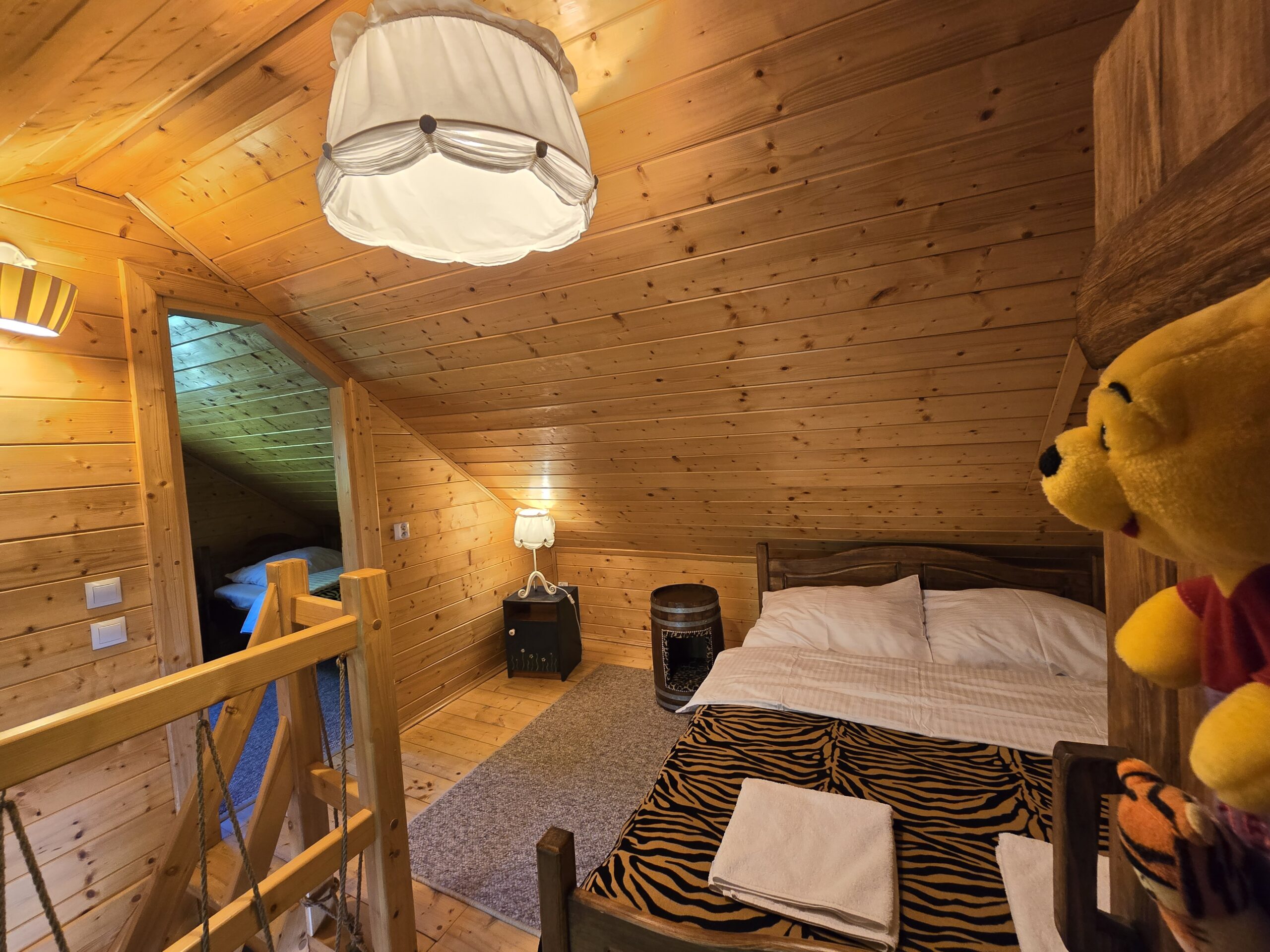 Ulubiony domek naszych najmłodszych gości w Bajkowej Osadzie  – Chatka Puchatka.  Skąd ta nazwa ?  Wystrój chatki nawiązuje do tej sympatycznej bajkowej postaci.   W środku znajdziecie stół wykonany z beczki po miodku, zydelki wykonane z beczek po miodku  a w sypialniach nawet nocne stoliki są wykonane z beczek po miodku.  Do tego ręcznie robione rustykalne meble i fajne dodatki… Całość sprawi , że naprawdę poczujecie się tutaj jak w domku misia , który kochał miodek.