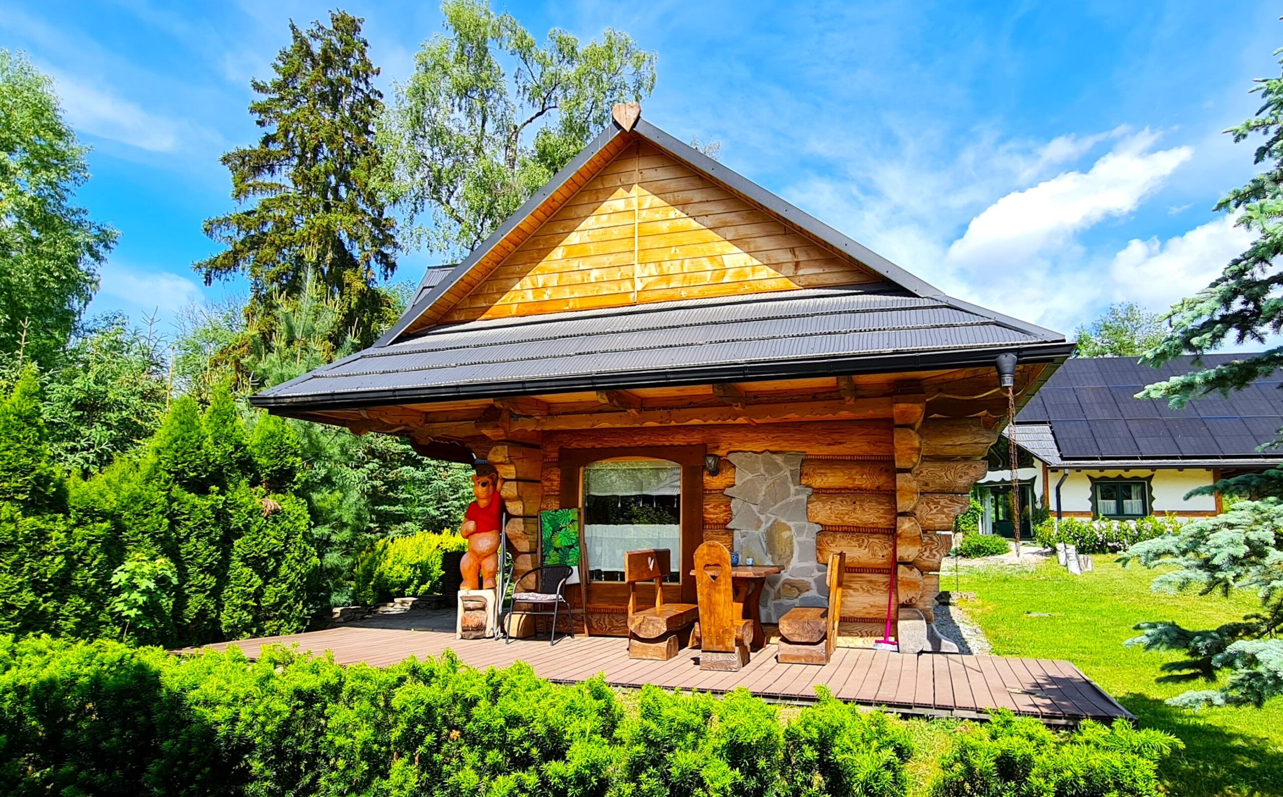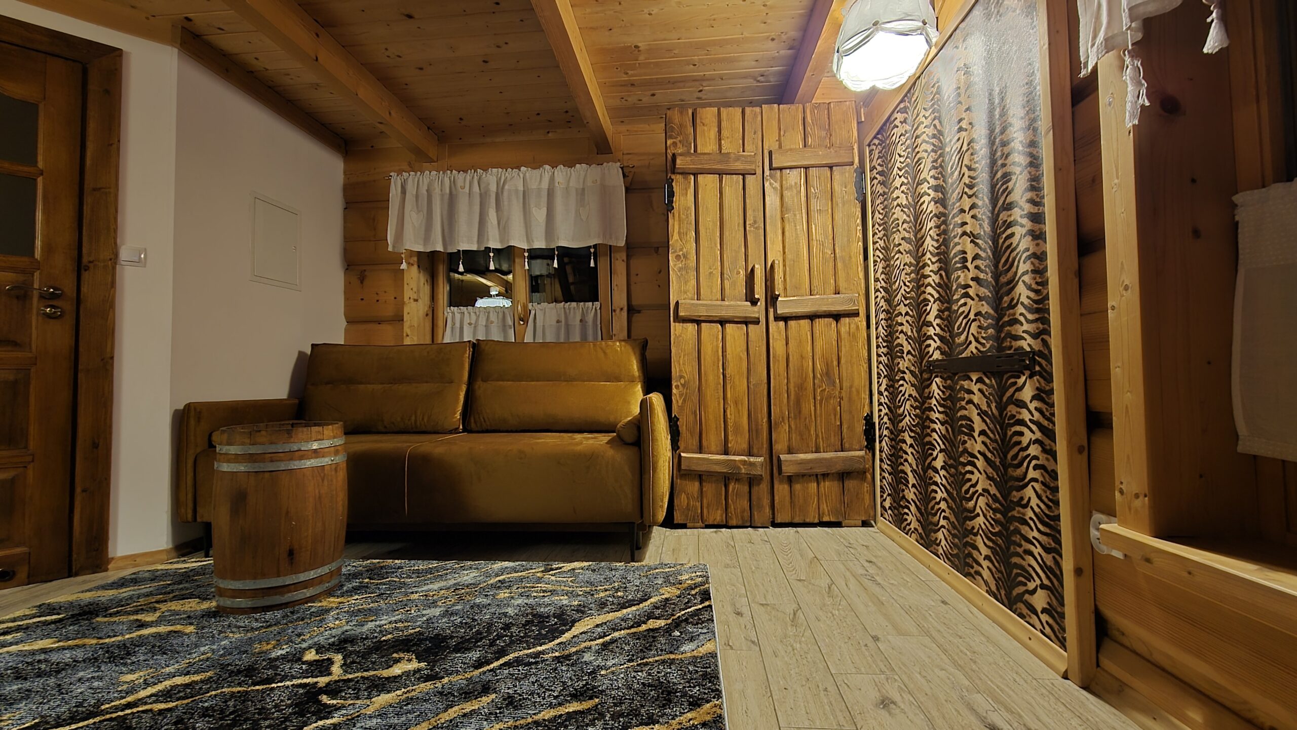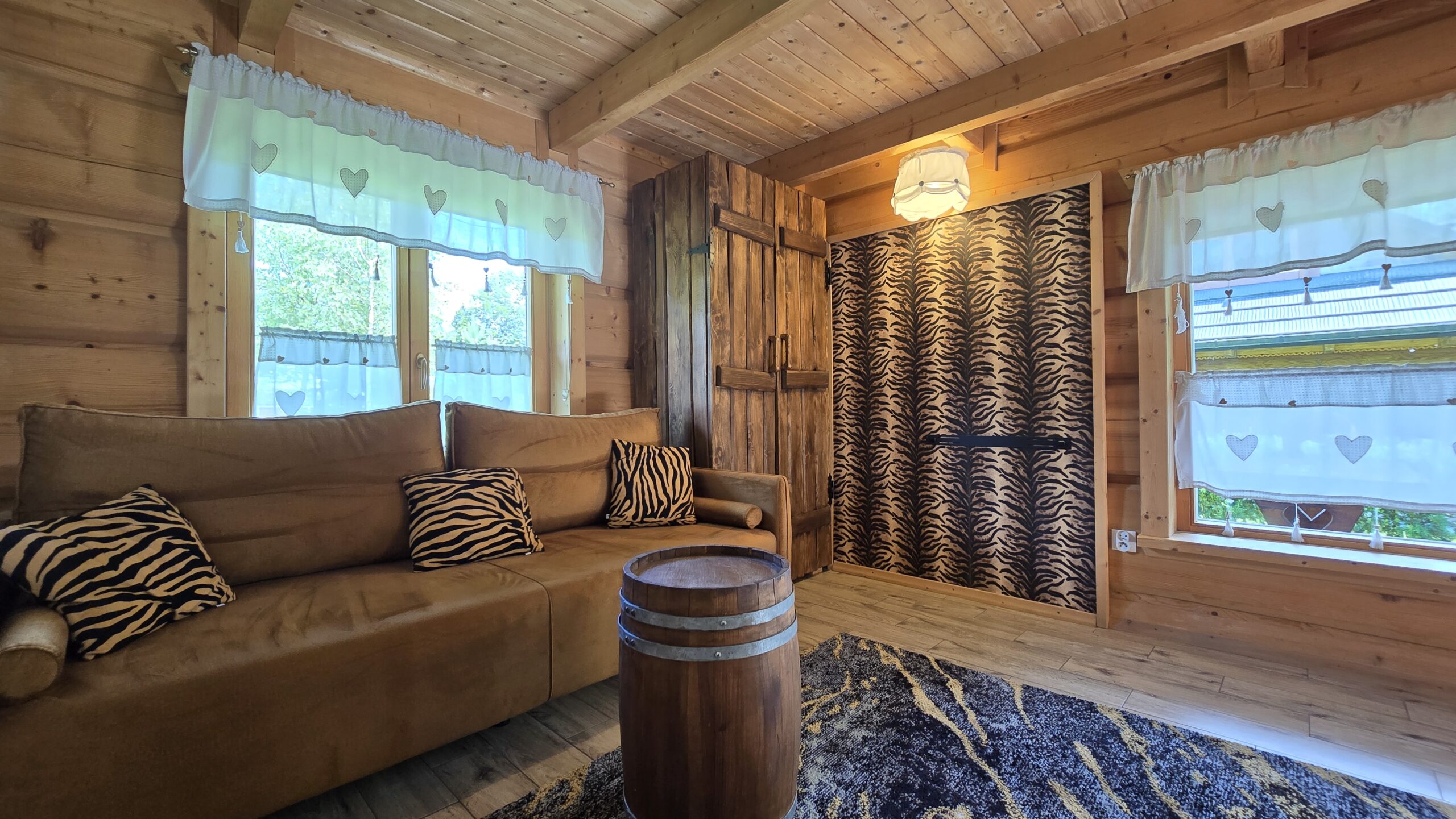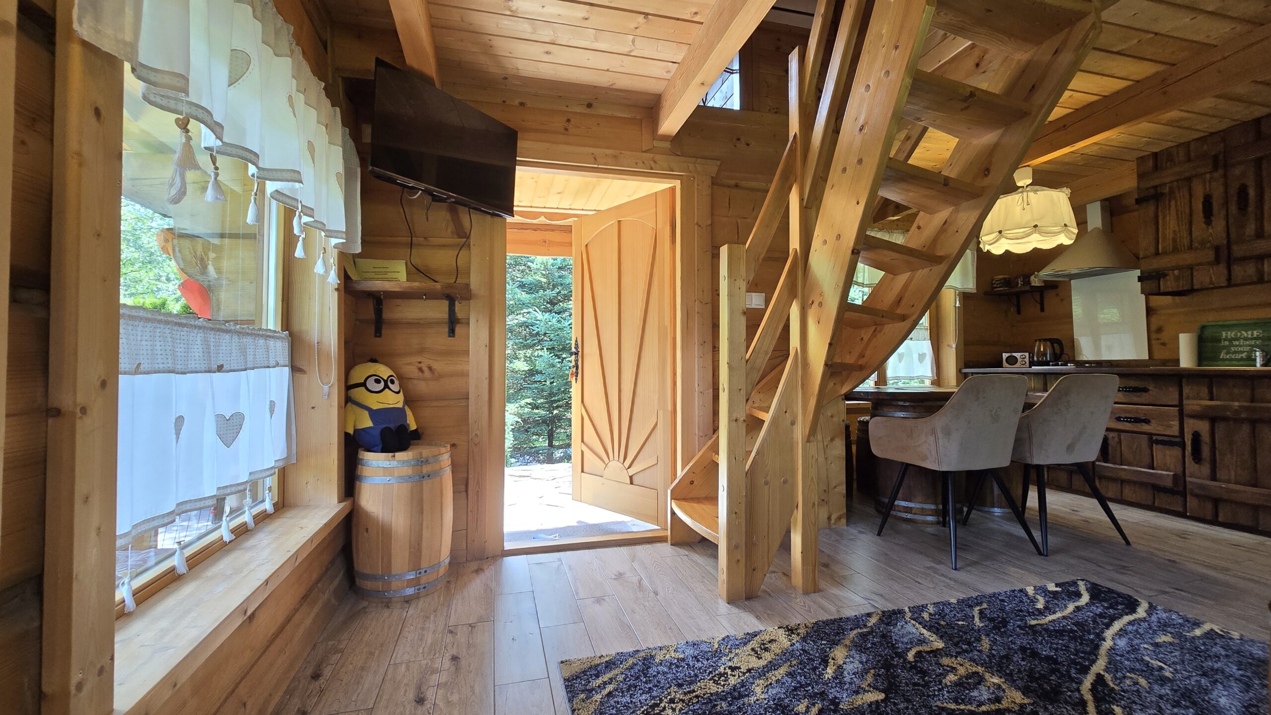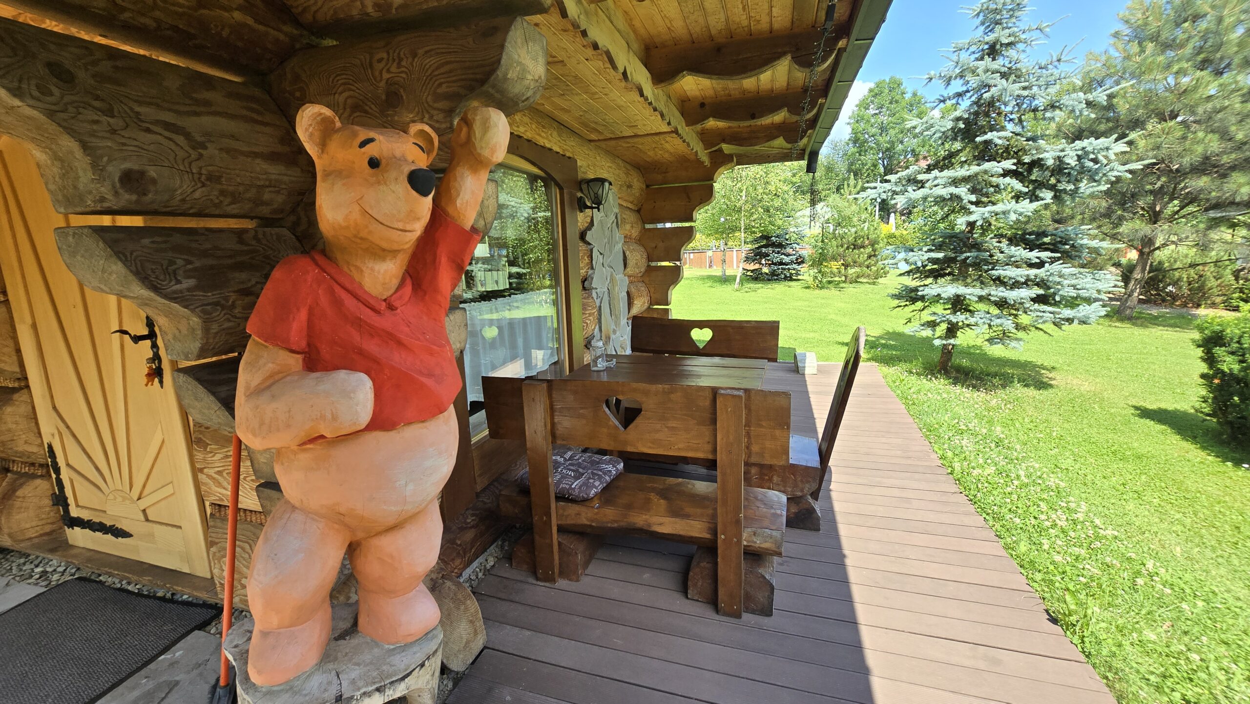 Ulubiony domek naszych najmłodszych gości w Bajkowej Osadzie  – Chatka Puchatka.  Skąd ta nazwa ?  Wystrój chatki nawiązuje do tej sympatycznej bajkowej postaci.   W środku znajdziecie stół wykonany z beczki po miodku, zydelki wykonane z beczek po miodku  a w sypialniach nawet nocne stoliki są wykonane z beczek po miodku.  Do tego ręcznie robione rustykalne meble i fajne dodatki… Całość sprawi , że naprawdę poczujecie się tutaj jak w domku misia , który kochał miodek.