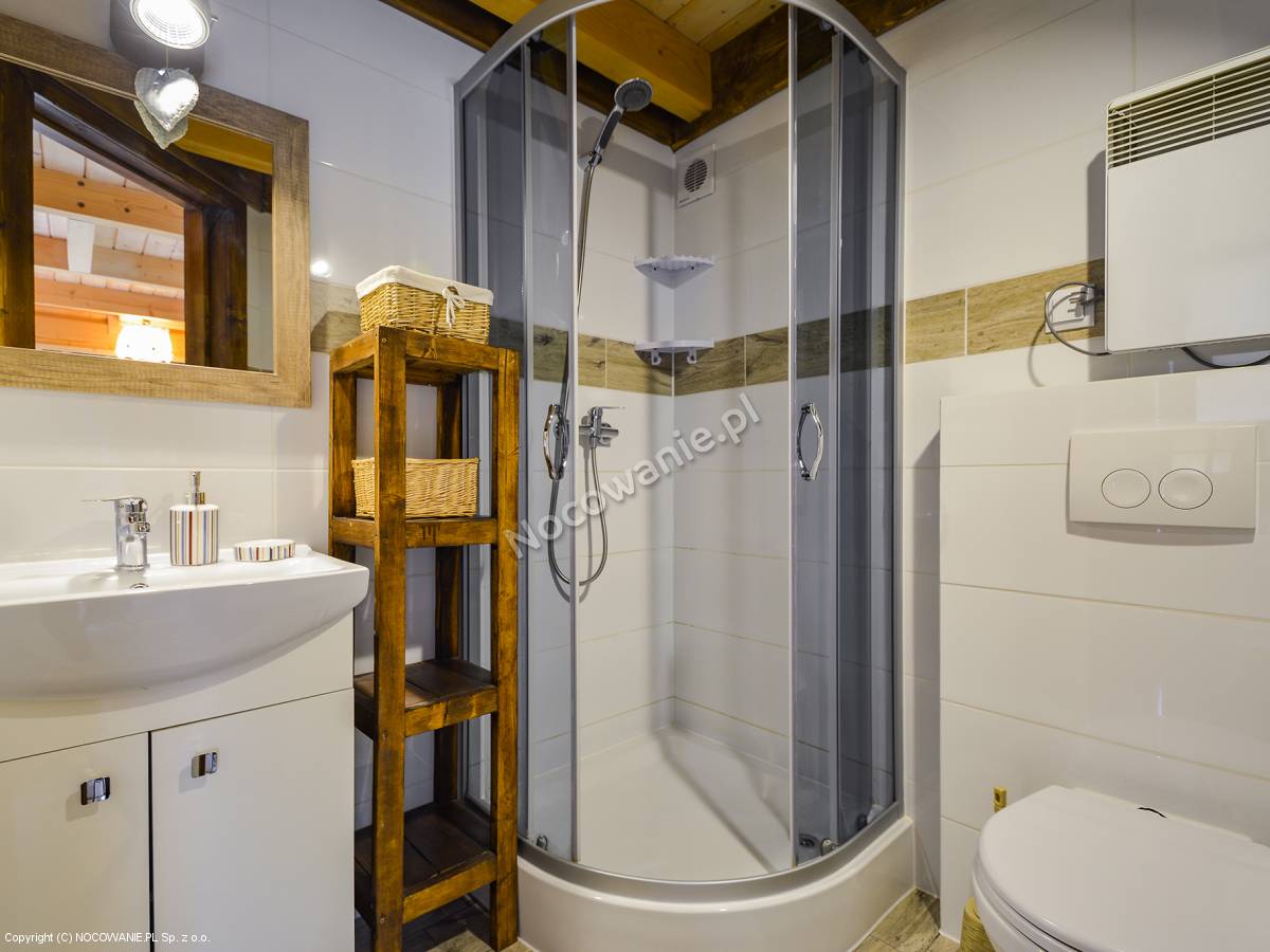 W aneksie kuchennym znajdziecie wszystko co jest niezbędne do samodzielnego przygotowania posiłku. Jest kuchenka gazowa dwupalnikowa z zapalarką, kuchenka mikrofalowa oraz lodówka. Jest też oczywiście zlewozmywak.  W rustykalnych szafkach znajdziecie niezbędne naczynia , garnki, talerze , szklanki , sztućce i różne przydatne akcesoria kuchenne.  Jeżeli czegoś będzie Wam brakowało zawsze możecie od nas pożyczyć.   Ciepła woda pochodzi z bojlera elektrycznego. Ogrzewanie też jest wyłącznie elektryczne.  Główne źródło ciepła to  grzejniki akumulacyjne i konwekcyjne.