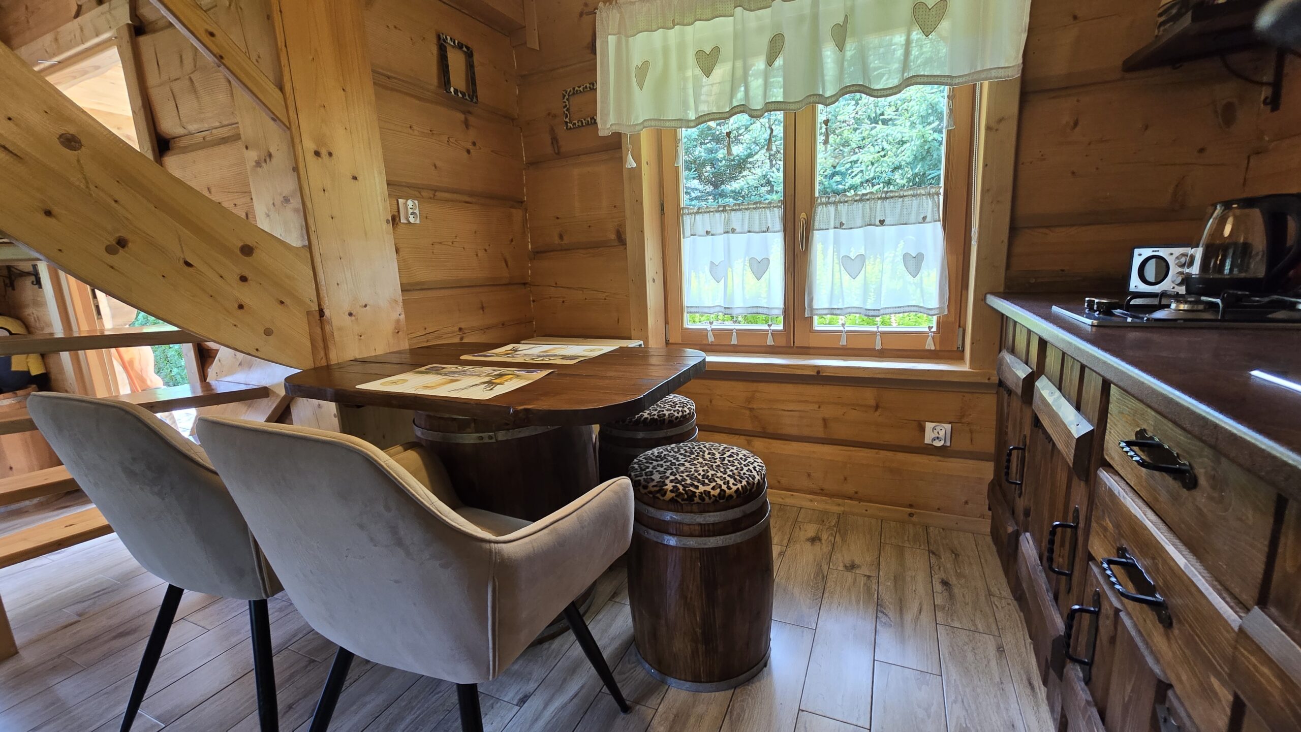 W chatce na dole znajdziecie pokój dzienny z aneksem kuchennym oraz łazienkę z kabiną prysznicową. Dość strome schodki prowadzą na poddasze gdzie na antresoli jest  dwuosobowe łóżko o wymiarach 140 X 200 cm a w wydzielonej i zamykanej sypialni są dwa łóżka pojedyncze o wymiarach 90 X 200 cm.  Chatka nominalnie przewidziana jest dla 4 osób ale na antresoli, przy jaskółce  jest jeszcze rozkładany fotel na którym może przenocować dodatkowe dziecko. Chatka jest zatem świetną propozycją dla rodzin w składzie nawet 2+3.