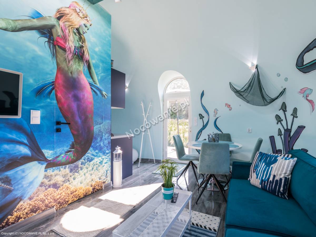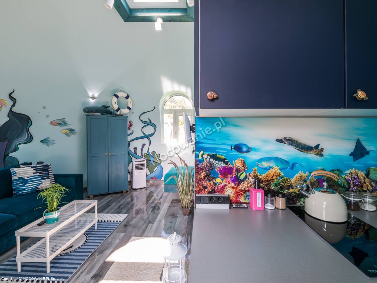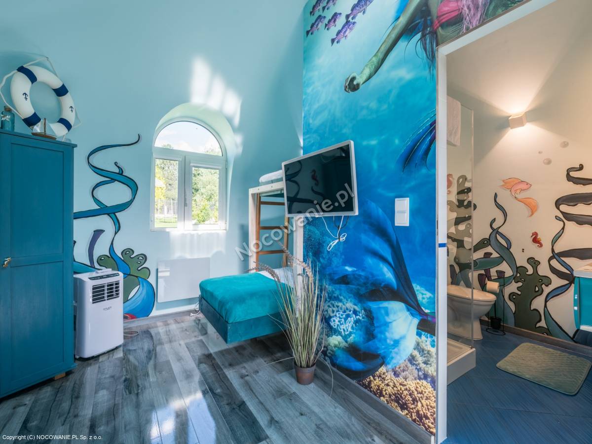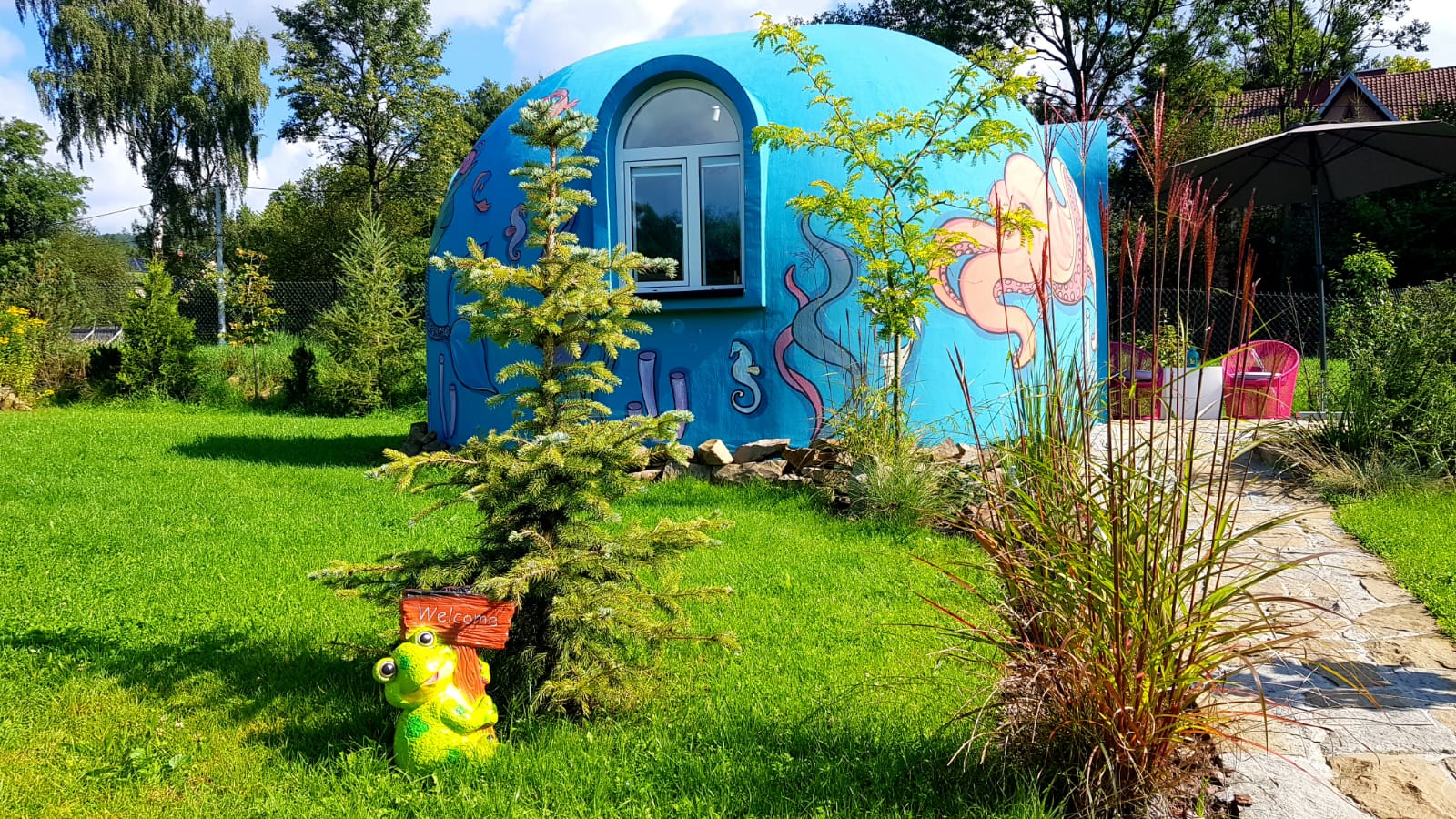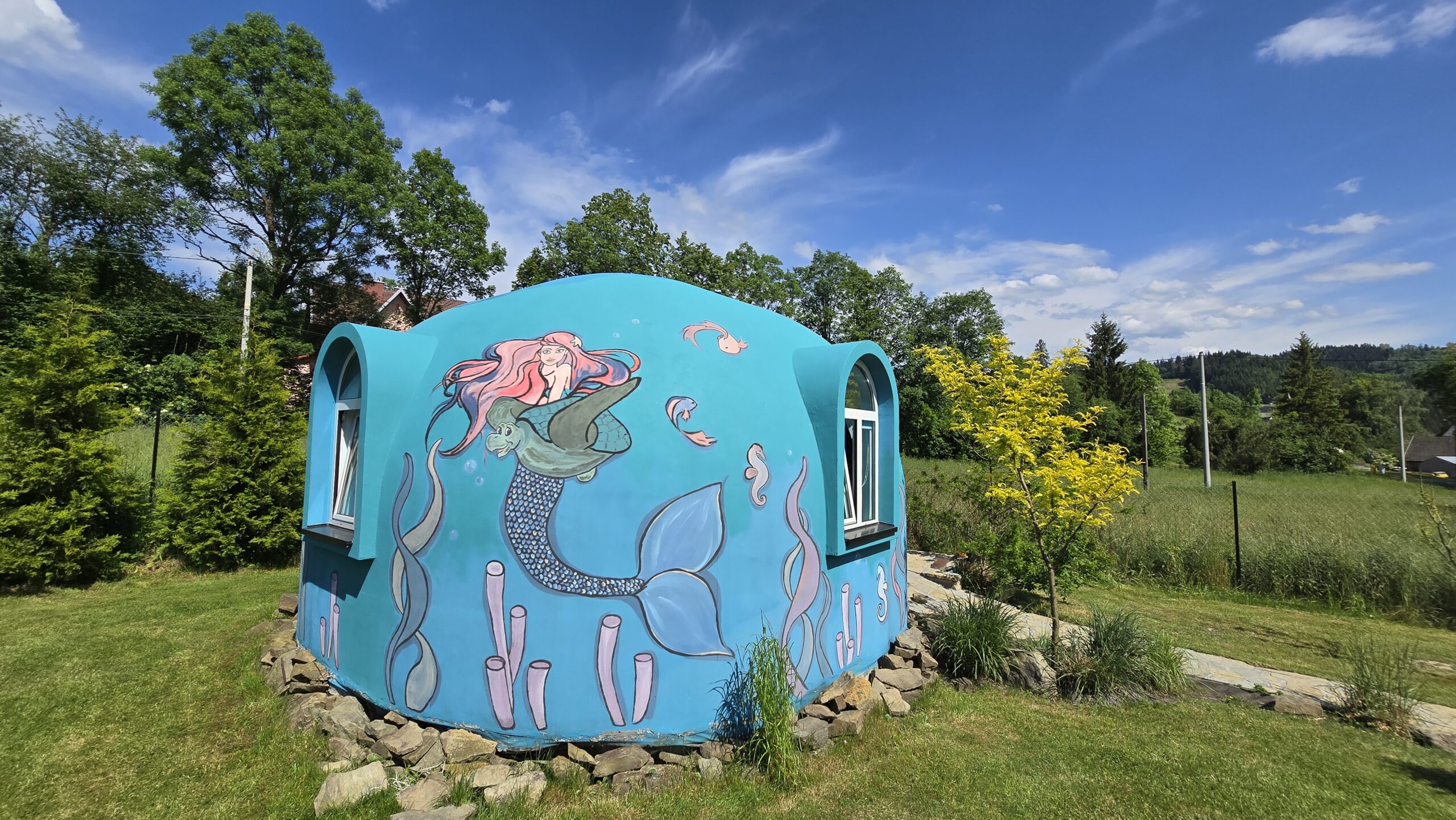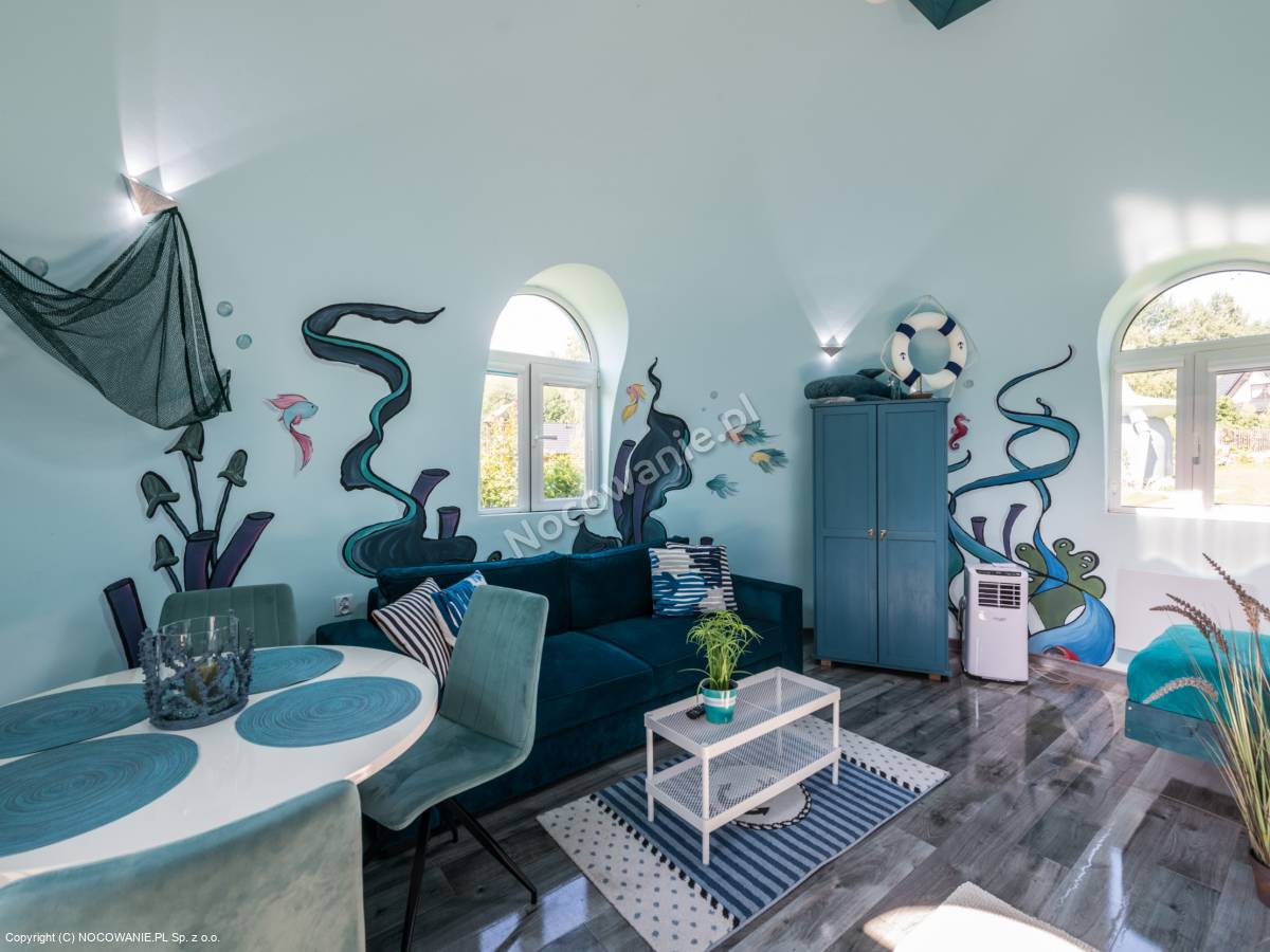 Oferujemy Państwu wypoczynek  w niezwykłym domku kopułowym , zwanym też domkiem sferycznym.   Domek  został uruchomiony w pierwszych dniach lipca 2020 r.  Wystrój domku został oparty na motywach baśni o Małej syrence , stąd też nazwaliśmy ten domek  Morskim . Całość jest niepowtarzalna i bardzo stylowa, wręcz bajkowa ( jak przystało na domek w Bajkowej osadzie)