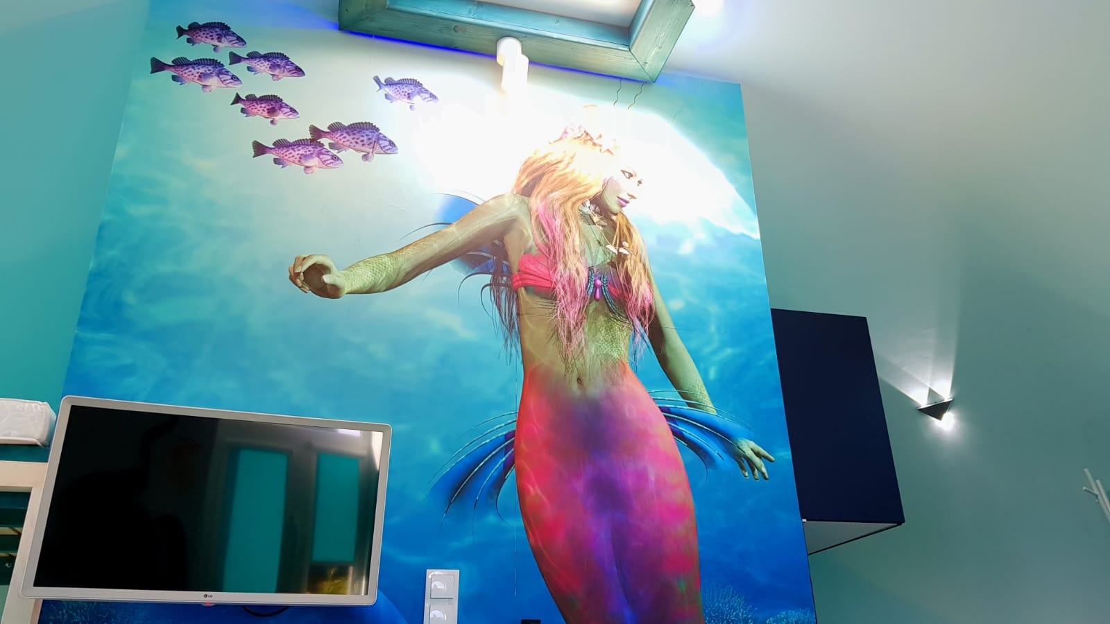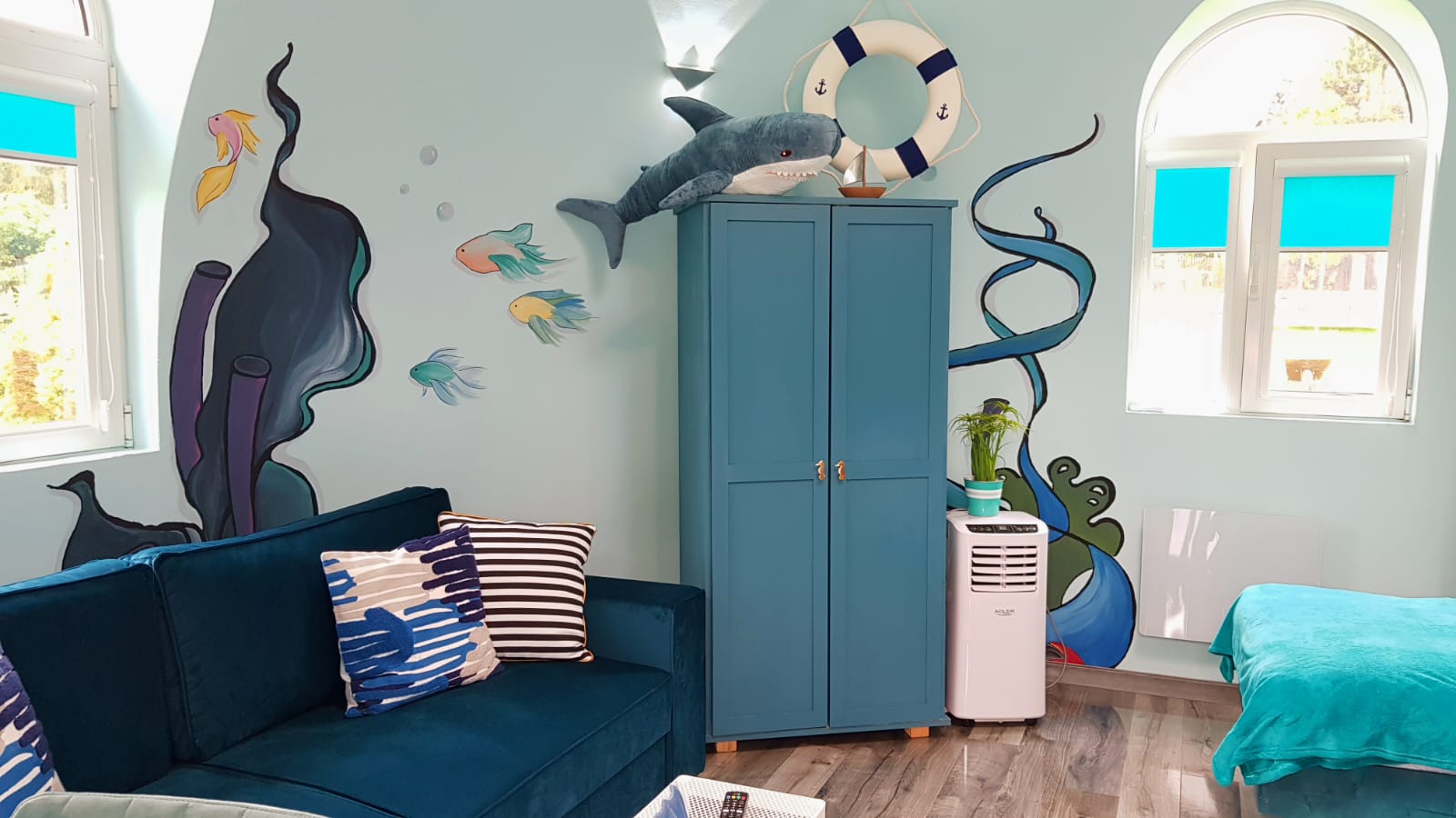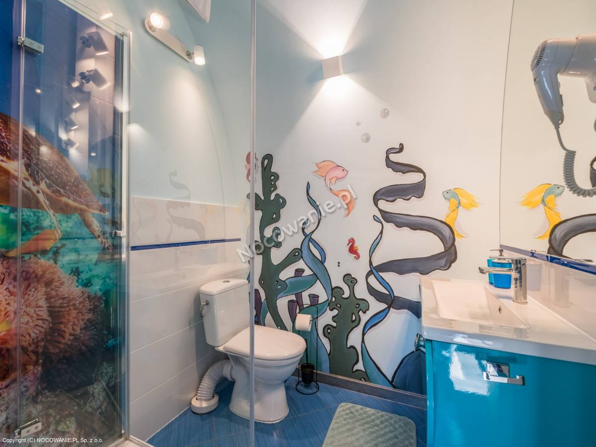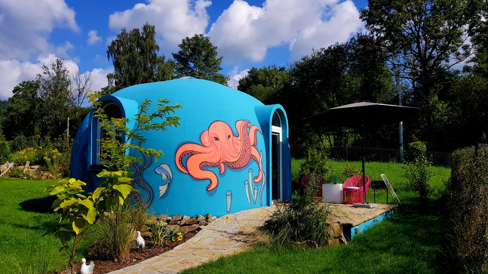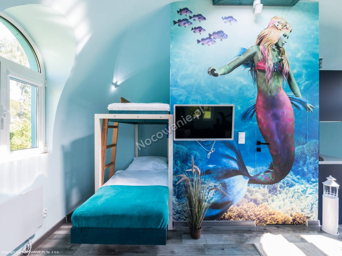 Oferujemy Państwu wypoczynek  w niezwykłym domku kopułowym , zwanym też domkiem sferycznym.   Domek  został uruchomiony w pierwszych dniach lipca 2020 r.  Wystrój domku został oparty na motywach baśni o Małej syrence , stąd też nazwaliśmy ten domek  Morskim . Całość jest niepowtarzalna i bardzo stylowa, wręcz bajkowa ( jak przystało na domek w Bajkowej osadzie)