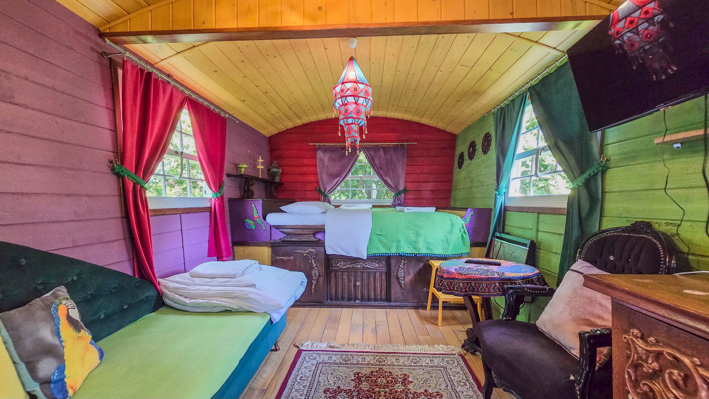 Zamieszkaj w prawdziwym, luksusowo wyposażonym, wozie cygańskim. Wóz o powierzchni ponad 15 m2 , tak jak poprzedni, został wykonany na specjalne zamówienie przez profesjonalną firmę, zajmującą się budową powozów konnych.